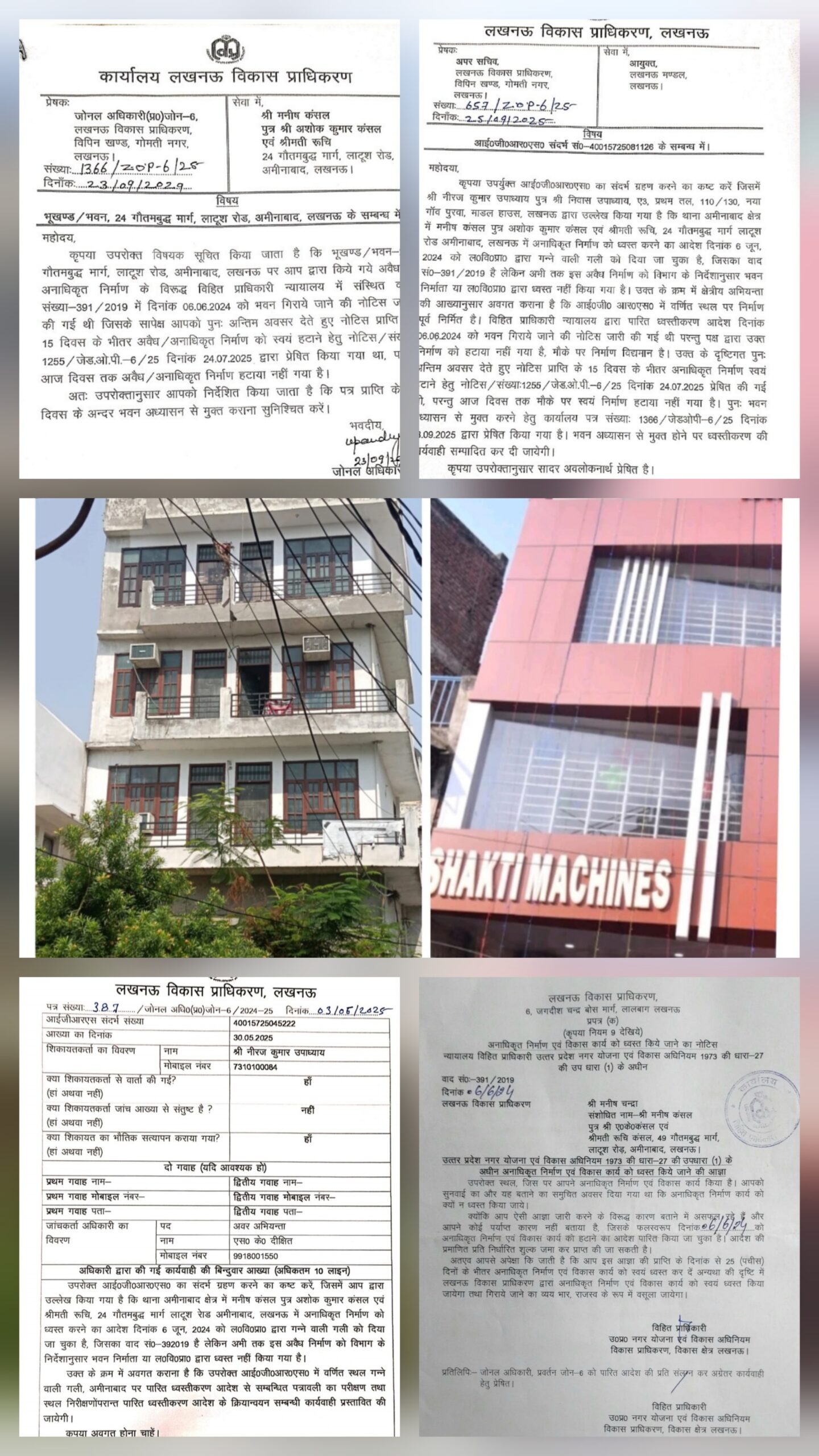 जहां पर लखनऊ विकास प्राधिकरण के मानक के विपरीत चार मंजिला निर्माण किया गया जा चुका है।जिसे वर्ष 2021 में लखनऊ विकास प्राधिकरण की पूर्व संयुक्त सचिव श्रीमती ऋतु सुहास के द्वारा भवन को सील कर दिया गया था, लेकिन उसके बावजूद जोन छः के तत्कालीन जूनियर इंजीनियर राकेश सचान द्वारा 130000 रुपए लेकर निर्माण को जारी रखा और पूरी तरह से भवन बंद करके तैयार हो गई। जोकि लाटूश रोड पर स्थित विद्यांत कॉलेज के समीप शक्ति मशीन के नाम से स्थापित है।जिसमें गन्ने वाली गली की साइड से चार मंजिला अपार्टमेंट बना हुआ है,जो पूरी तरह से अवैध है और इस भवन के ध्वस्तीकरण का आदेश दिनांक 06/06/2024 को लखनऊ विकास प्राधिकरण के द्वारा जारी किया जा चुका है, लेकिन दुर्भाग्य की बात है कि लखनऊ विकास प्राधिकरण के भ्रष्टाचार की भेंट चढ़ा यह भवन अभी भी ध्वस्त नहीं हो सका।