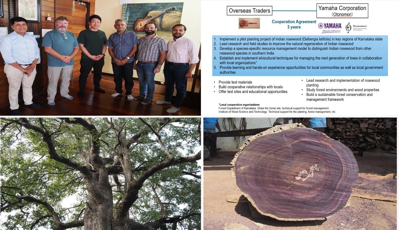 Yamaha Corporation और Overseas Traders, जो भारत में भारतीय रोज़वुड (Indian Rosewood) की प्रमुख लकड़ी सप्लाई करने वाली कंपनी है और दुनिया भर के गिटार निर्माताओं को यह लकड़ी उपलब्ध कराती है, ने भारतीय रोज़वुड के संरक्षण और प्रबंधन को मजबूत करने के लिए एक संयुक्त समझौते पर सहमति जताई है। यह समझौता नवंबर 2025 में हुआ है और भारत में रोज़वुड पेड़ों के टिकाऊ वन प्रबंधन को बढ़ावा देने पर केंद्रित है।इस साझेदारी के तहत Yamaha और Overseas Traders भारतीय रोज़वुड की एक टिकाऊ सप्लाई चेन विकसित करेंगे, जंगल से लेकर तैयार वाद्ययंत्र तक की प्रक्रिया को जिम्मेदारी से प्रबंधित किया जाएगा। दोनों कंपनियाँ इस पेड़ की प्रजाति के संरक्षण के लिए रिसर्च और डेवलपमेंट में भी सहयोग करेंगी।
